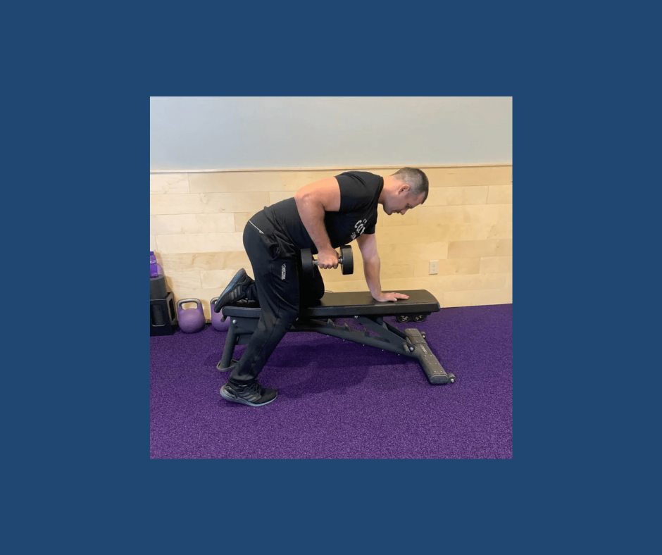 With a dumbbell in one hand and your arm straight, place the opposite knee and hand on a bench. Keeping your back flat and in line with the bench, lift the dumbbell up to the side of your chest, bending your elbow. Lower the dumbbell back until your arm is straight.